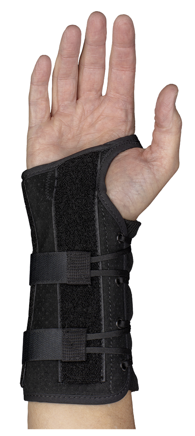 Ulnar, palmar and dorsal aluminum stays work in concert to restrict radial-ulnar deviation and minimize flexion-extension of the wrist. All stays are malleable and may be adjusted to provide a custom fit. Ulnar and palmar stays may be removed if desired for a progressive treatment protocol.